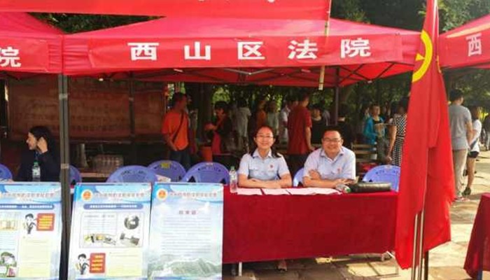 2014年7月25日上午,昆明市青年文明号集体践行党的群众路线之“走基层 近青年 办实事”暨西山区西苑街道青年工作共建委员会“实施七彩工程,共创文明城区”主题活动在春苑小区拉开帷幕。西山区人民法院团支部陈思源、张林敏参加了该次活动,为春苑小区居民进行法制宣传,对居民所提出的法律问题进行了耐心解答。